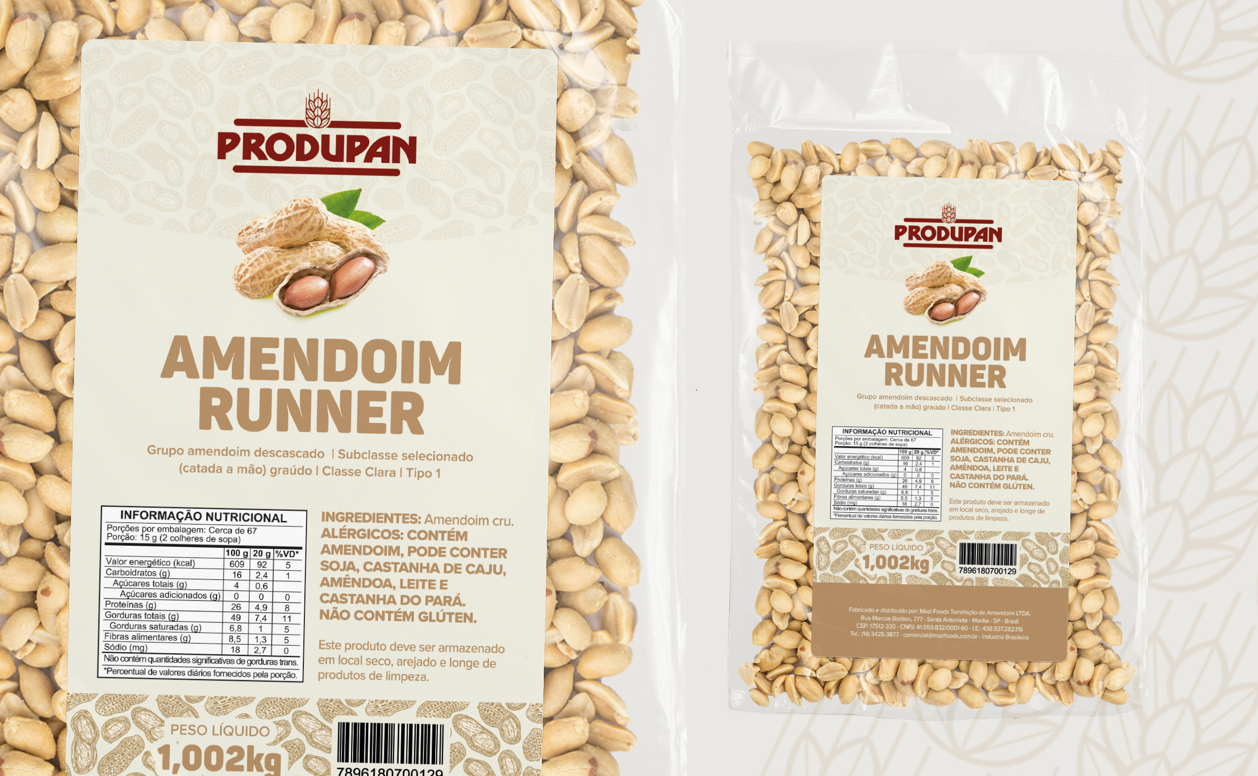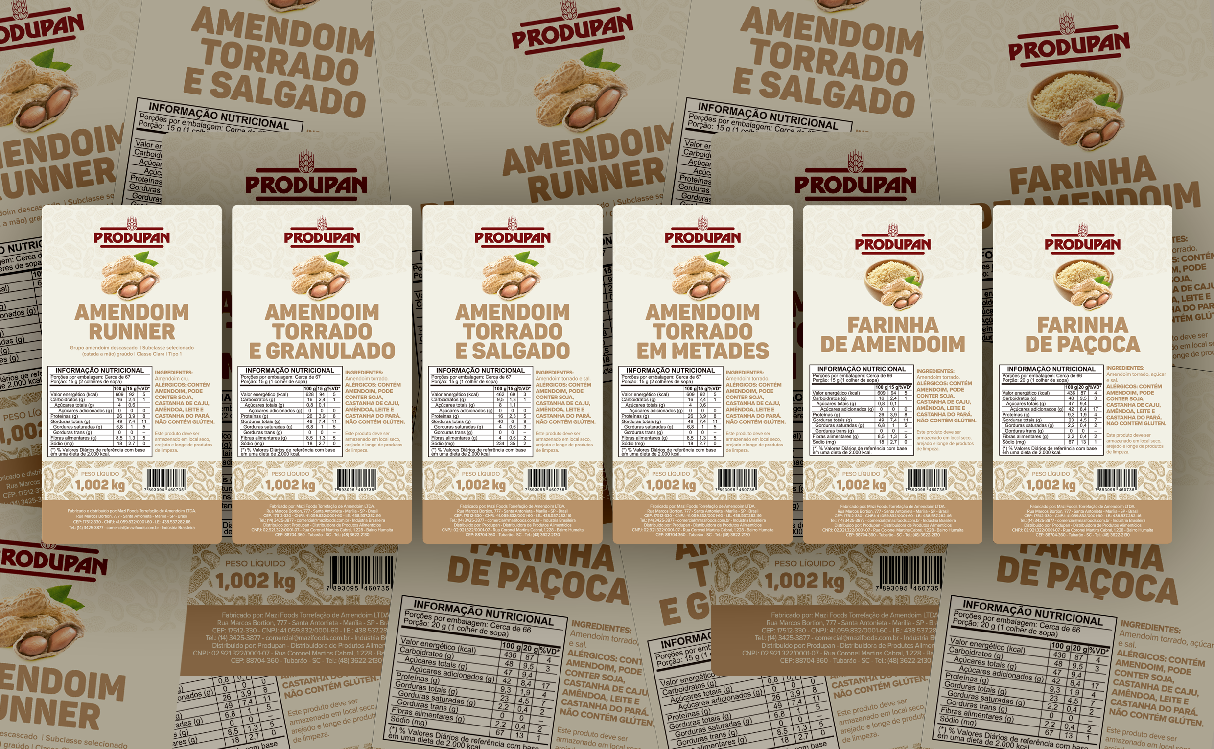 Desenvolvimento de rótulo para linha de amendoins da marca Produpan, com foco em clareza visual, padronização de produtos e destaque no ponto de venda. O projeto buscou criar uma linguagem gráfica simples e organizada, capaz de comunicar rapidamente o tipo de produto e suas variações, mantendo consistência entre os diferentes sabores e formatos da linha. A composição prioriza hierarquia tipográfica clara, cores neutras que remetem ao alimento natural e elementos visuais que reforçam o produto principal. O resultado é um rótulo funcional, de fácil leitura e replicação, que fortalece a identidade da marca e facilita a identificação dos produtos pelo consumidor.